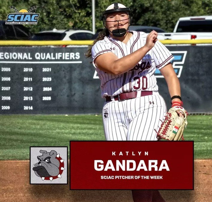 Katlyn Gandara of Whittier, who was SCIAC’s Week 8 Player of the Week for March the week of March 22, 2026, has been an engine for the Bulldogs’ 13-game streak.